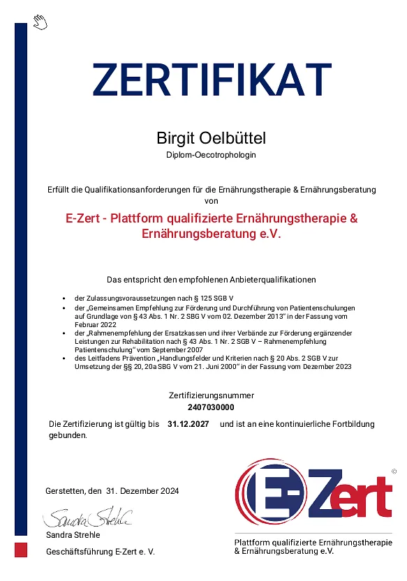 Ich bin Jahrgang 1966, verheiratet und Mutter von zwei erwachsenen Töchtern. Ich habe in Hamburg Ernährung und Hauswirtschaft studiert (Abschluss 1990). Seit 25 Jahren führe ich meine eigene Praxis für Ernährungstherapie und Beratung in Hamburg. Meine Patienten schätzen meine einfühlsame Art, den Bezug zur Praxis sowie die individuelle Beratung.